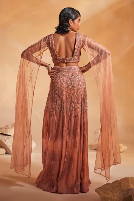 Buy_Divya Aggarwal_Coral Crushed Organza Abstract Plunge V Lilo Embroidered Skirt Set_Online_at_Aza_Fashions