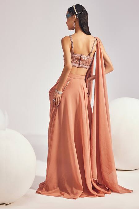 Blush pink 3D scallop blouse featuring cut-out neckline and embellished with pearls and sequins. Paired with a matching concept saree in georgette with an attached side drape.
