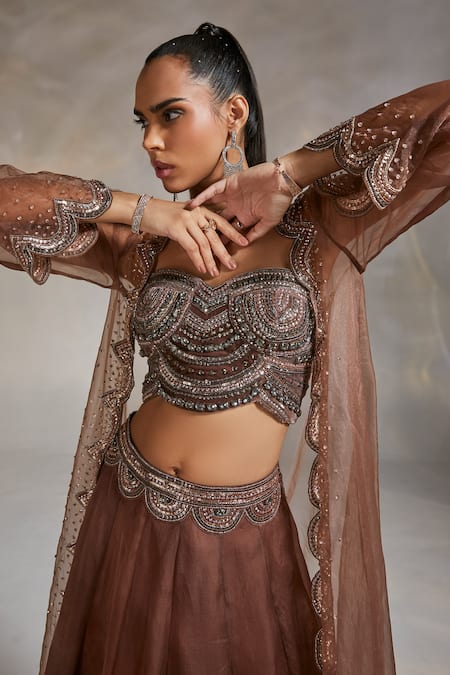Cognac brown organza scallop embellished over-sized cape with sheer sleeves. Paired with lehenga with attached cancan & padded corset blouse.