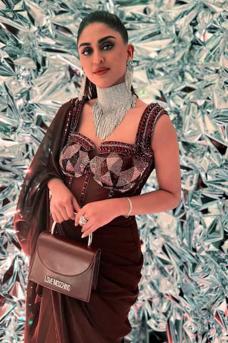 Wine pre-draped saree made from georgette featuring crystal embellished borders. Paired with a satin and lycra mesh corset blouse adorned with cutdana, crystals, and sequins.