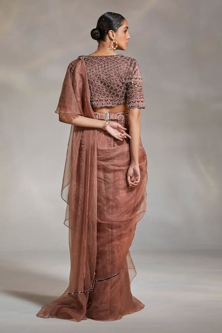 Pink organza pre-draped saree with ruffle details. Paired with embellished padded blouse & belt.