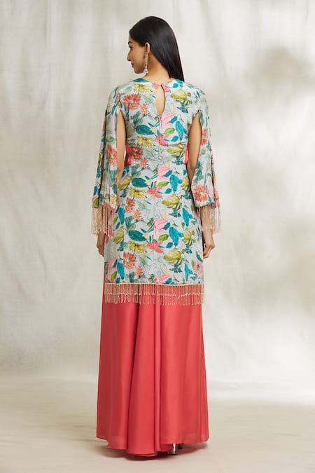 Sky blue crepe kurta featuring an all-over floral print, long cape sleeves, and crystal fringe drop tassels. Paired with a coral silk blend flared sharara with inverted box pleats.