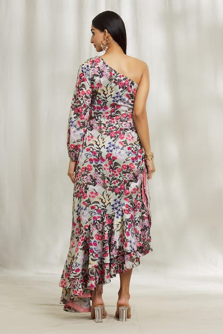 Green Modal, Satin, Crepe Asymmetric One Shoulder Floral Print Dress