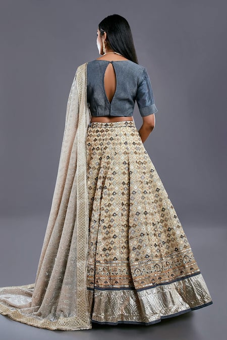 Grey blouse with pleated detail & back cut-out. Paired with contrast beige lehenga with multi color thread work & sequins dupatta.