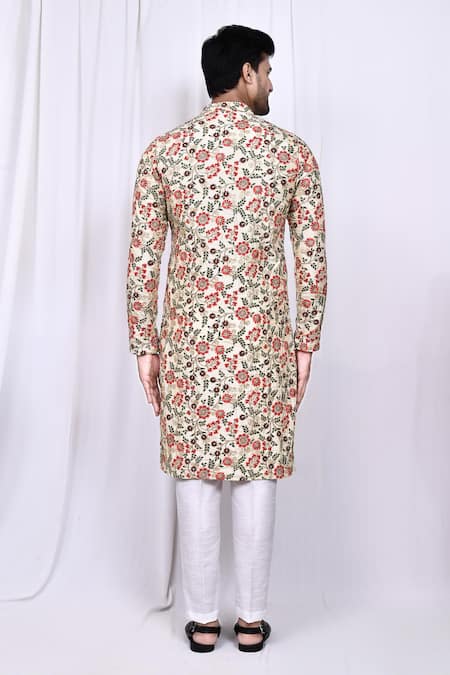 Multi color kurta featuring full sleeves and a band collar with all over Gardenia bloom embroidery. Paired with a white straight fit pant.