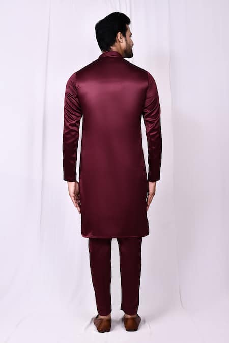Maroon kurta featuring a band collar and full sleeves, crafted in satin silk. Paired with matching pant pyjama for a complete look.
