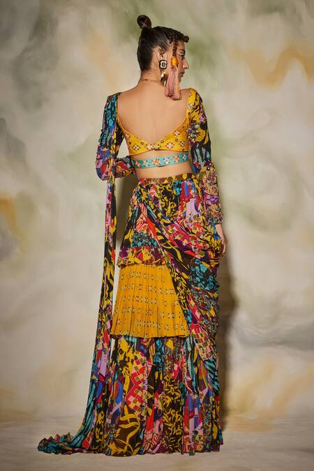 Multicolored skirt saree with aztec print & layered detail. Paired with embroidered, printed blouse.