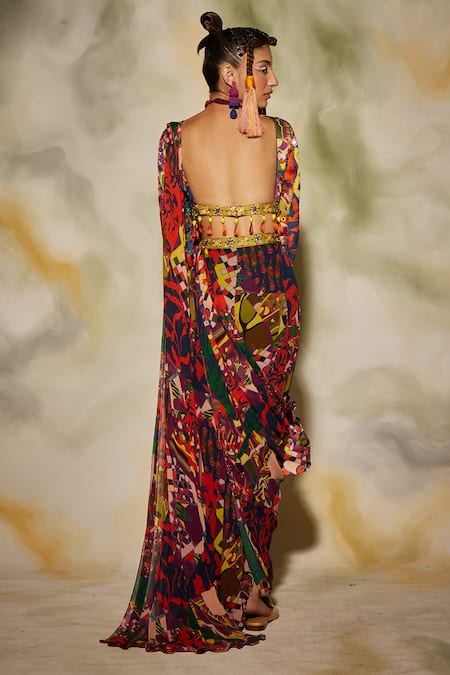 Multicolored sharara saree with aztec print. Paired with aztec print, embroidered blouse & potli bag.