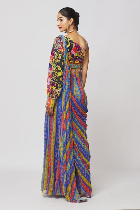 Blue sharara saree with multicolor stripe print featuring a scoop neck and asymmetric sleeves. Paired with an aztec print blouse and a potli bag.