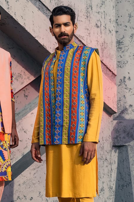 Multicolored cotton silk lined bundi with front buttons & striped, floral print. Paired with yellow kurta.
