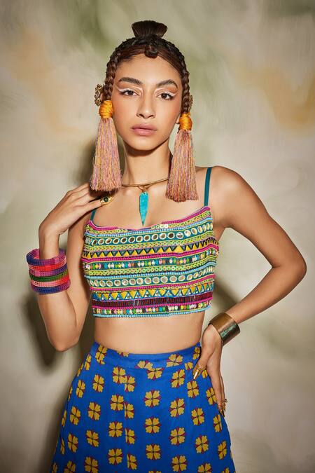 Teal bustier with tribal embroidered detail. Paired with blue butta print gharara pant & cape.