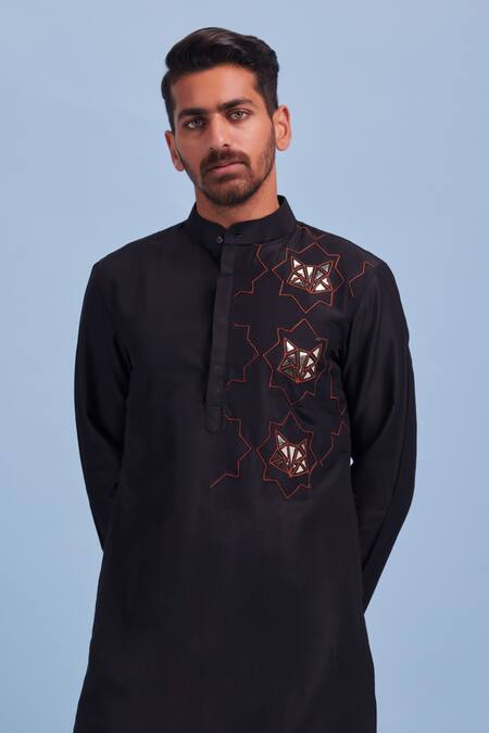 Black kurta with thread & acrylic fauna embroidered motifs.