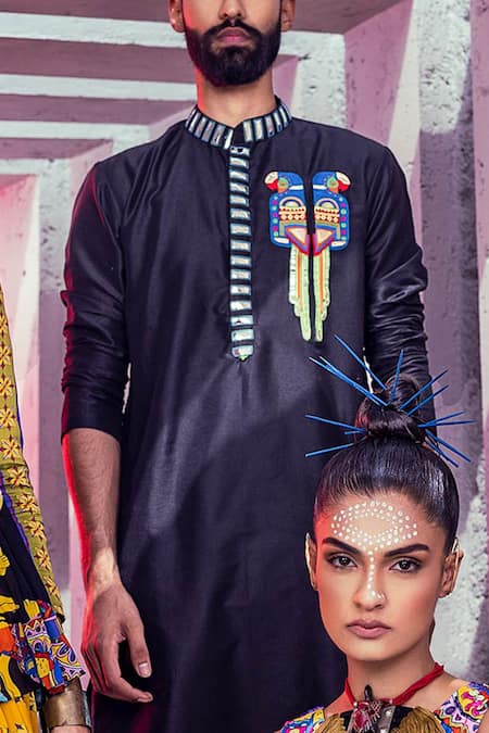 Black cotton lined kurta with thread & acrylic embroidered placket & parrot motifs.
