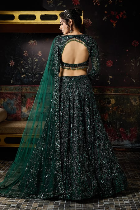 Green Tulle Sequins, Embroidery Square Neck Embellished Lehenga Set