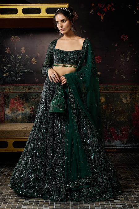 Emerald green embellished blouse with full sleeves and a square neckline. Paired with an embellished lehenga and an embroidered dupatta, complemented by a matching potli bag.