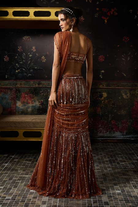 Metallic rust embellished bustier with a pre-draped mermaid skirt saree. The ensemble features a satin lycra and shantoon lining for comfort.