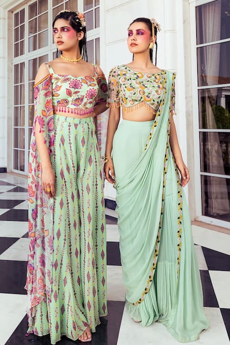 Mint green pre-draped gharara saree featuring floral jaal, cutdana, and sequins embroidered borders. Paired with a heavily embroidered backless blouse with crystal beads on the edges.