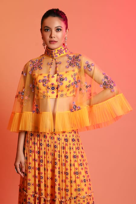 Mustard cape with floral embroidered motifs & pleated border. Paired with floral printed tiered lehenga & floral printed crop top.