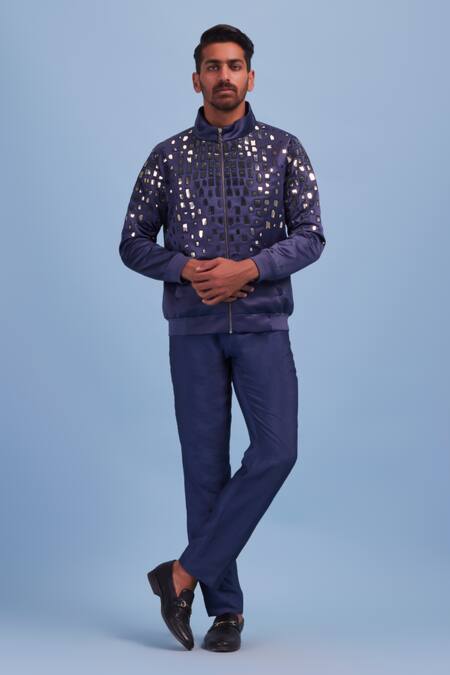 Cool grey jacket with thread & acrylic geometric embroidered motifs. Paired with pant.