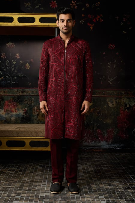 Maroon jacket featuring red thread and cutdana embroidery. Paired with maroon pants.