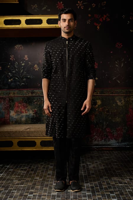 Black dola silk jacket featuring golden ombre embroidery. Paired with black pants.