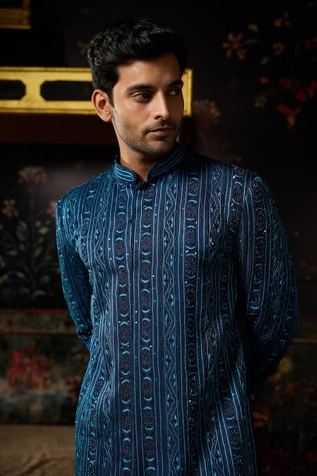 Blue embroidered jacket featuring linear thread details. Paired with matching blue pants.