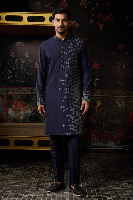 Dark blue kurta featuring diamond stone thread and cutdana mix embroidery. Paired with matching blue pants.