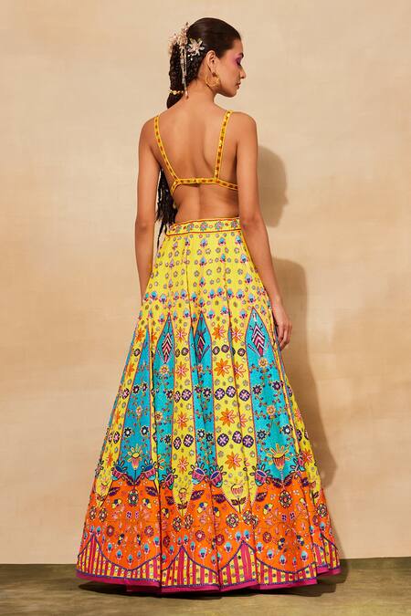 Yellow lehenga featuring geometric prints and pleated details. Paired with an embroidered blouse and a choker dupatta.