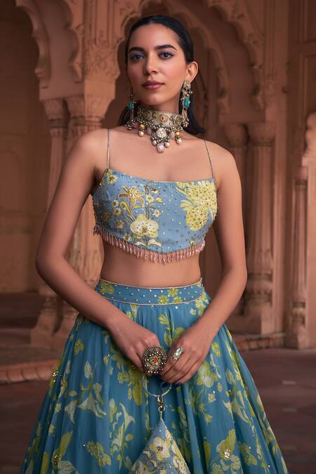 Ice blue lehenga featuring floral print and sequins embroidered waistband. Paired with a padded blouse and a triangle bag.