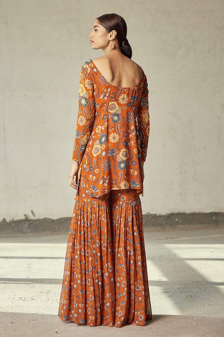 Orange Georgette Floral Boat Print Kurta And Gharara Set