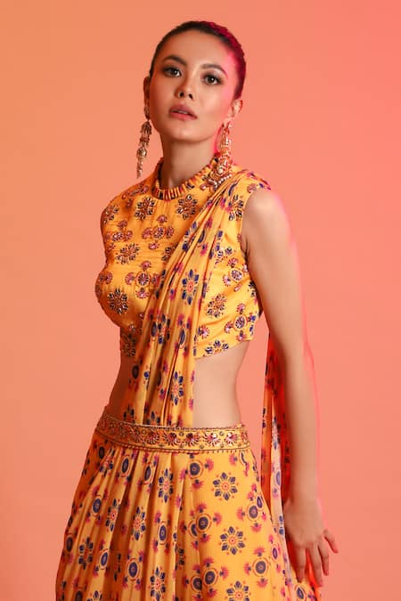 Mustard pre-draped sharara saree with floral jaal printed motifs & draped detail. Paired with Meenakari work blouse & leather embroidered belt.