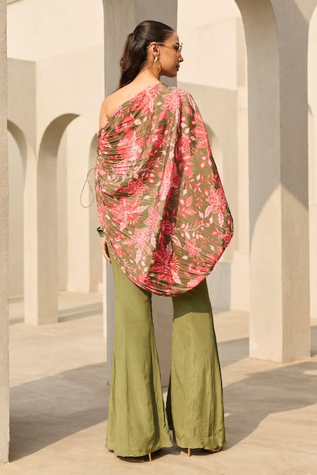 A sage green floral printed one-shoulder top crafted from crepe fabric, featuring structured pleats and a butter crepe lining. It is paired with a solid sage green bustier top and solid sage green bell-bottom pants, also made from crepe with a butter crepe lining.