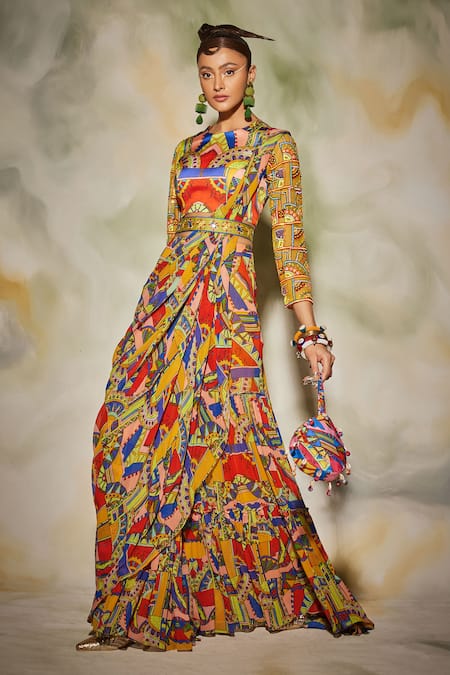 Multicolored gharara saree with neon geometric print. Paired with printed tulle blouse in geometric cutdana embroidered sleeves. Comes with belt & potli bag.
