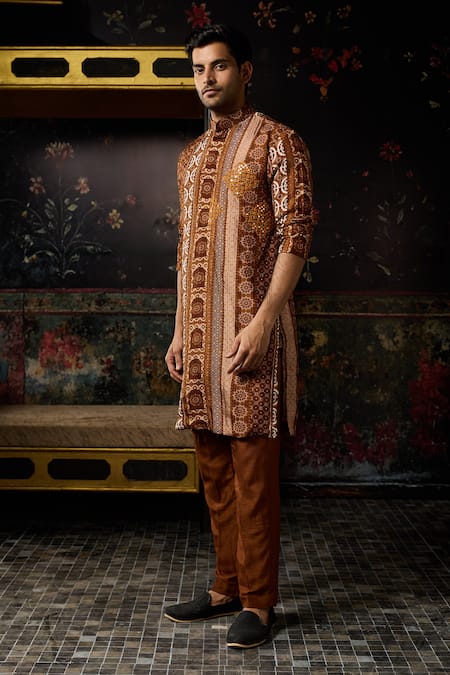 Caramel kurta featuring geometric prints and highlighted details. Paired with caramel pants for a coordinated look.