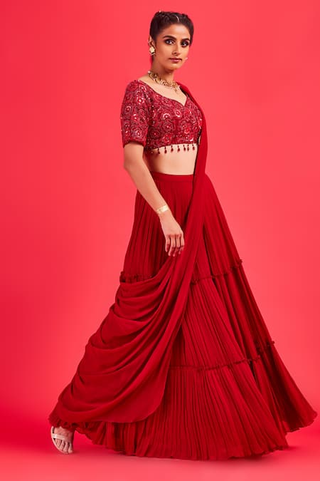 Red pleated lehenga saree with tiered silhouette and attached drape. Comes with floral embroidered padded blouse.