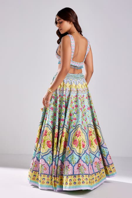 Blue Tulle, Silk Beads, Sequins Lotus Blossom Print Embellished Lehenga Set