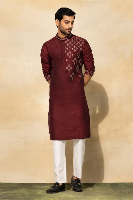 Maroon , Satin Embroidery Bundi And Kurta Set
