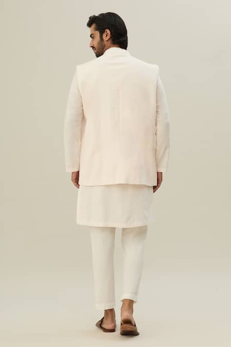 Pink bundi featuring placement mirror and thread embroidery. Paired with a matching kurta and pant.
