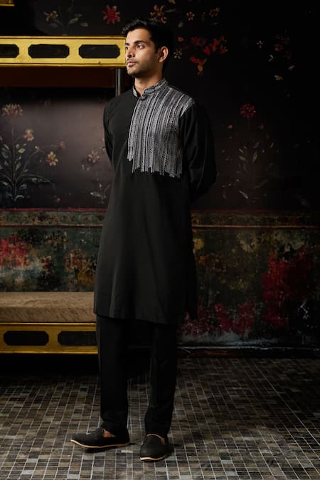 Black Cotton, Silk Embroidery Placement Kurta With Pant