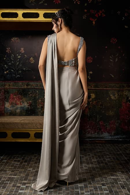 Grey mix material embellished corset style blouse featuring intricate detailing. Paired with a grey pre-draped border detailed skirt saree.