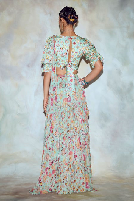 Mint green pre-draped skirt saree with all-over floral motif print & gathered tiers. Comes with cutdana- sequin embroidered blouse enhanced with tassels.