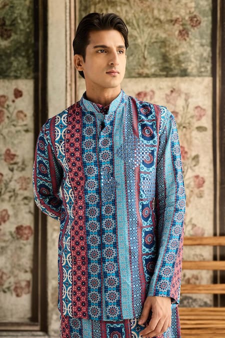 Blue bundi featuring linear prints paired with a matching kurta and blue pants. The ensemble highlights intricate patterns in a vibrant color palette.