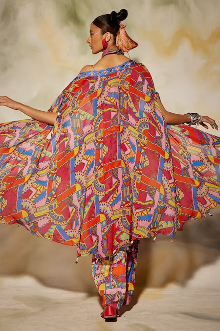 Multicolored cape with geometric print & tassel border. Paired with printed dhoti skirt & diamond cutdana applique embroidered bustier.