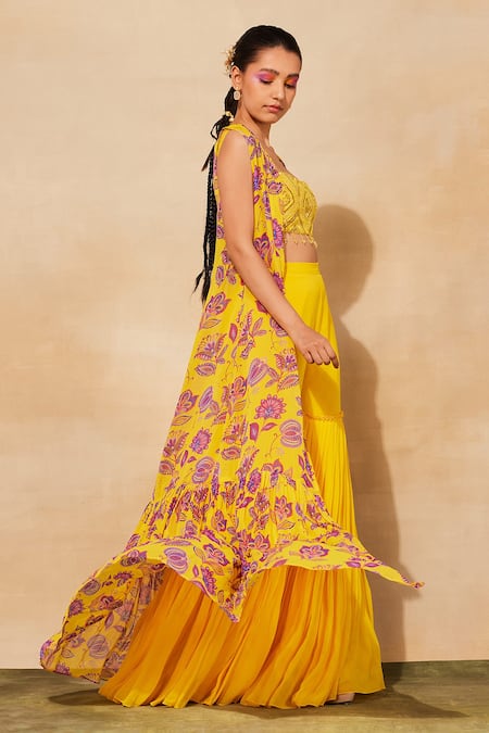 Yellow bustier featuring a square neckline with cutdana and beaded embroidery. Paired with a floral printed cape and tiered gharara pant.