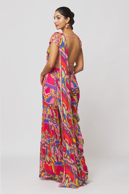 Pink gharara saree featuring blue geometric print with a thigh-high front slit. Paired with a cutdana applique embroidered blouse with a round neckline and half sleeves.