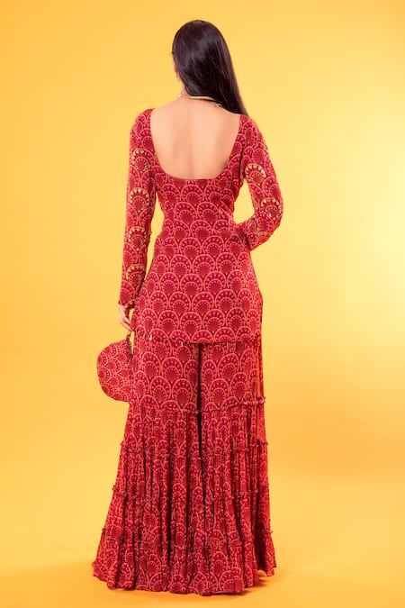 Maroon Georgette V Neck Printed Kurta And Sharara Set
