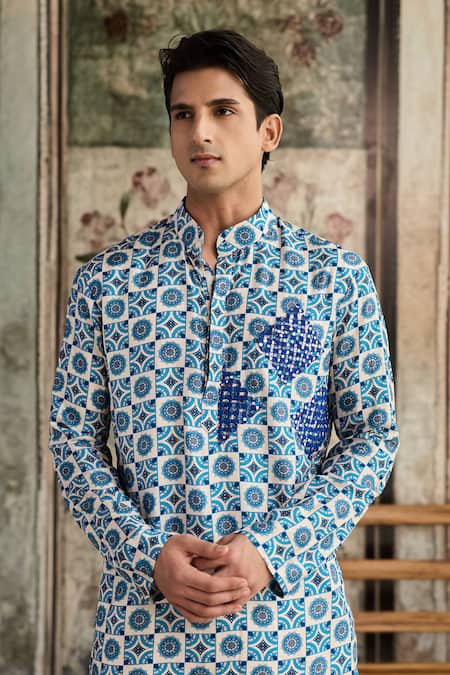 Blue and ivory printed kurta featuring a blue highlighted pocket. Paired with ivory pants for a complete look.