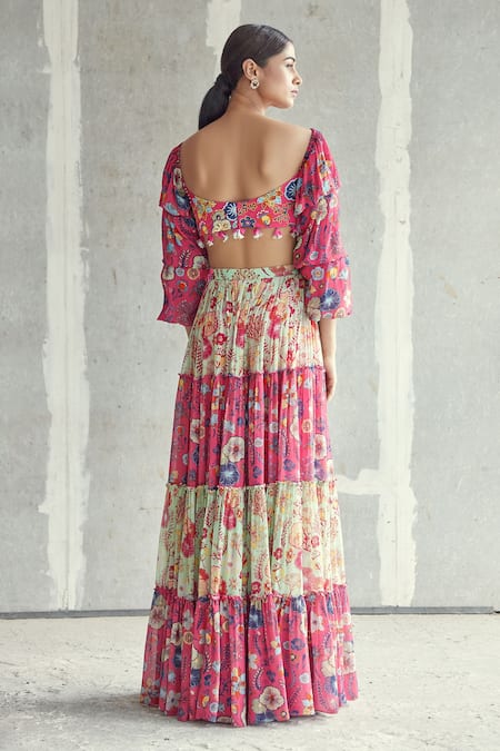 Pink Georgette, Modal Floral Motifs Sweetheart Printed Tiered Skirt With Blouse