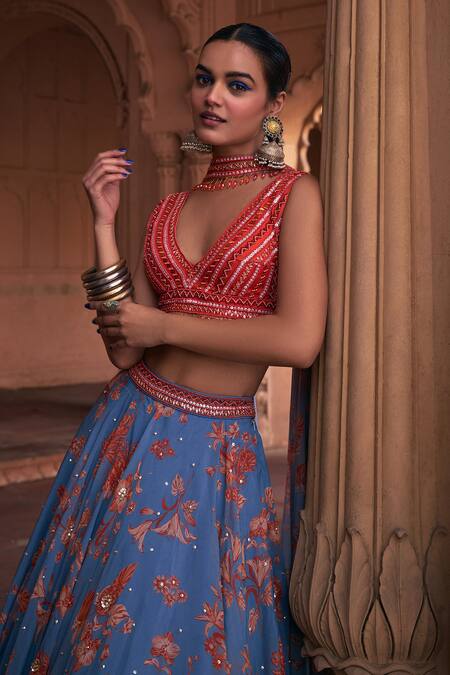 Slate blue lehenga featuring floral print and sequins embroidery. Paired with a rust sequins work padded blouse and a choker dupatta.