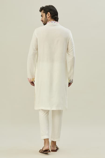White kurta featuring multicolored thread embroidery with a band collar and long sleeves. Paired with a matching pant for a complete look.